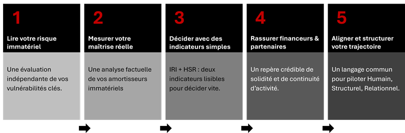 Voici les 6 raisons majeures, classées du plus important au moins important pour un dirigeant. N°1Obtenir une lecture claire et indépendante du risque immatérielLe risque immatériel est aujourd’hui le premier facteur de rupture pour les PME : perte d’un collaborateur clé, incident SI, fragilité managériale, dépendance client… Pourtant, il n’est ni mesuré ni explicité par les outils traditionnels. N°2Comprendre la maîtrise réelle des risques immatérielsDeux entreprises peuvent être exposées de la même manière, mais n’avoir pas du tout le même niveau de maîtrise. N°3Piloter votre entreprise avec des indicateurs simples et décisionnelsUn dirigeant a besoin d’indicateurs compréhensibles en quelques secondes, sans jargon.
