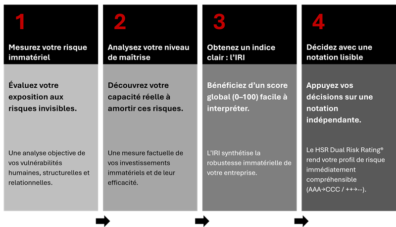 Vous recevez votre IRI, votre Rating HSR, et une lecture simple orientée DG.
