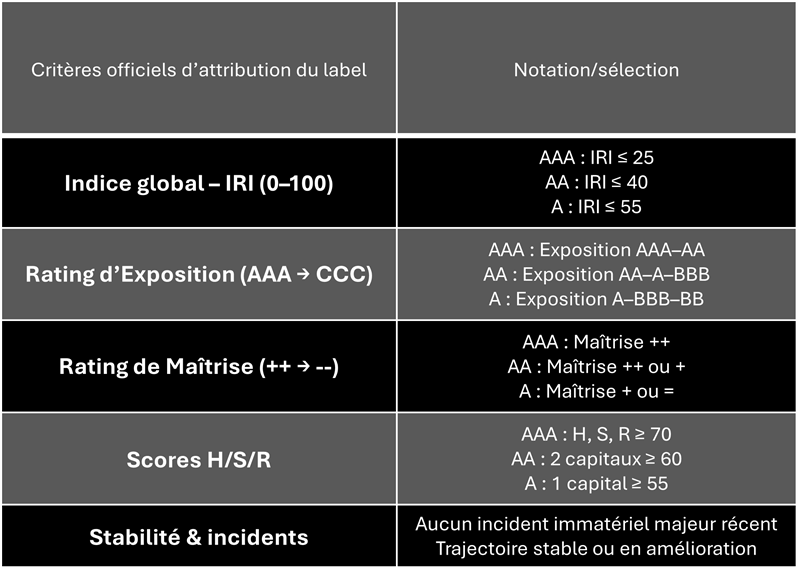 L’attribution du Label HSR Resilience® repose sur des critères stricts et vérifiables :