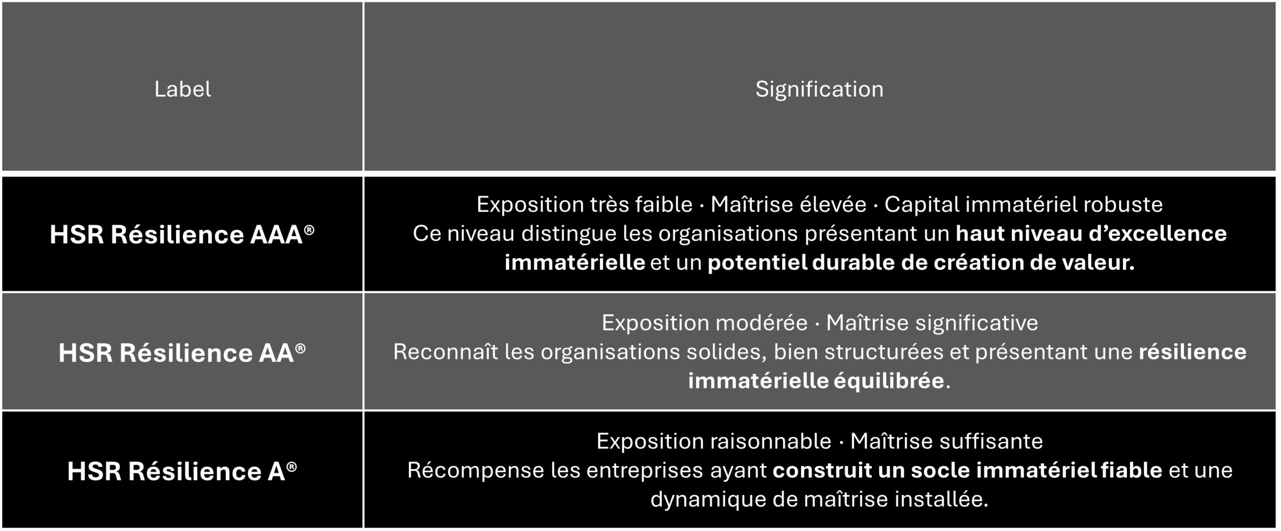 • Certificat officiel HSR Resilience AAA® / AA® / A®